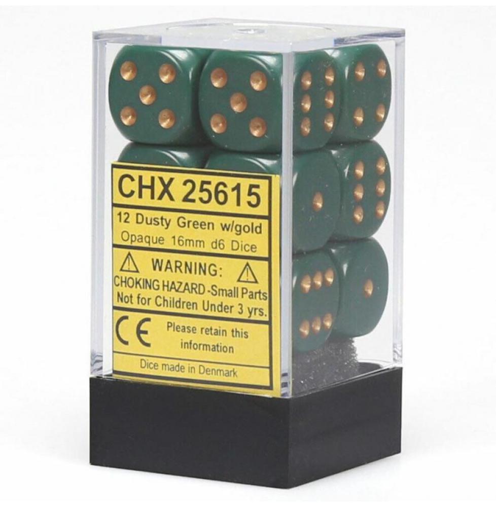 CHESSEX - Set de 12 dés 6 - OPAQUE - Vert Gris/Or