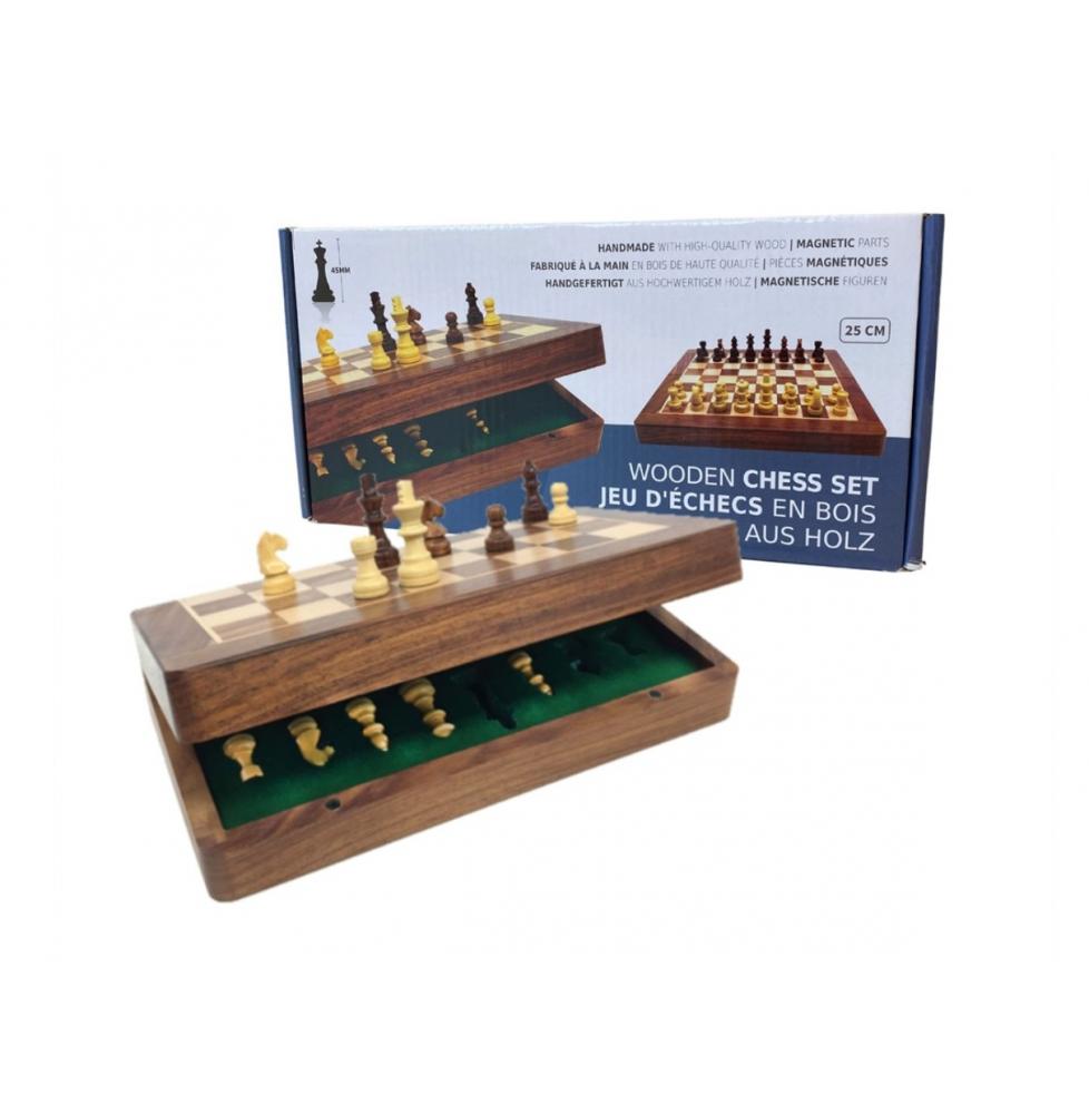 Jeu d'échecs de luxe de 25cm en bois marqueté à partir de deux essences de bois différente. De petite taille, 25 X 12,5 X 6 cm pour être emporté partout. Les pièces magnétiques lui donnent un confort appréciable pour jouer dans le train, en voiture ou sur un bateau. Le roi fait 44 mm de hauteur.